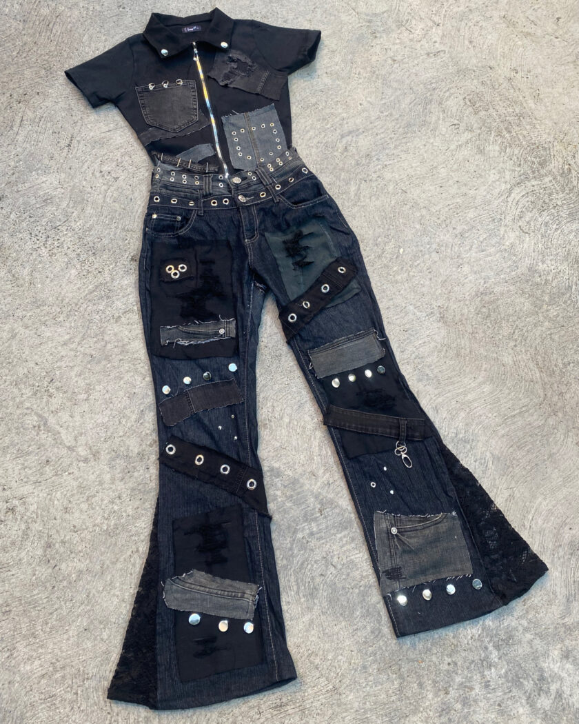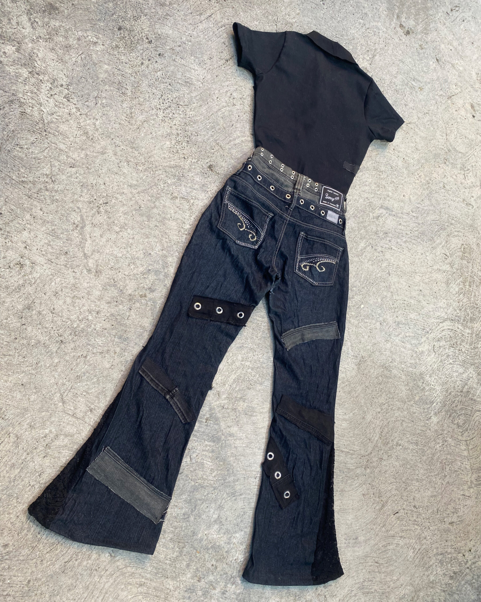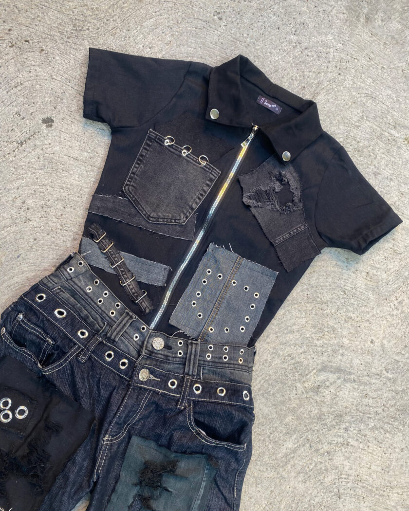 Top elaborado con tela de jean negra y accesorizado con retazos de jeans reciclados.